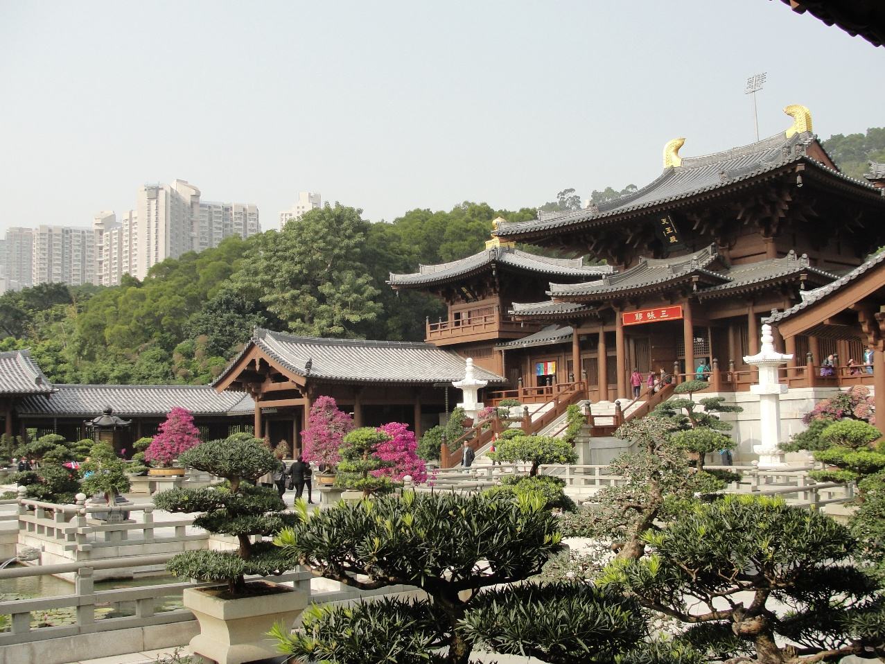 志莲净苑是唐制建筑,从外观看有一种雄伟古朴的感觉,行进入内,特别步入大雄宝殿附近,却有幽闲舒适、宁静之感,全木制的建筑、对称设计、回廊环抱,更能领会到古人智慧。为配合“志莲”的古朴设计,不少树木有数以百年计的树龄,其中更有两棵罗汉松是由湖南移植来港两千年以上,大大小小的树木姿态各异、妙趣横生。