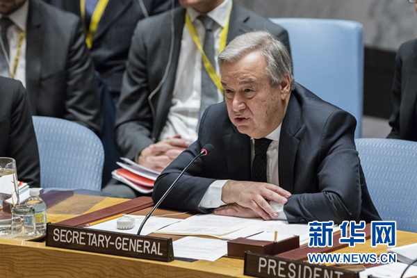2月21日,在位于纽约的联合国总部,联合国秘书长古特雷斯在安理会会议上讲话。联合国安理会当日举行会议,悼念20日突然离世的俄罗斯常驻联合国代表丘尔金。 新华社记者李木子摄