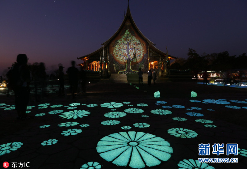 当地时间2017年2月20日,泰国乌汶府,诗琳通瓦拉蓝寺坐落在高山上,是一座琅勃拉邦式寺庙,有人字形的大屋顶,三层屋檐低垂,屋顶中央有像王冠般的金色装饰。它的大雄宝殿是没有墙和窗的开放式建筑,宝殿后有一幅巨型的菩提树壁画,涂上了一层夜光物料,到了晚上会发出绿色的关,再配上繁星满天的夜晚,因此又得名“萤光寺”。