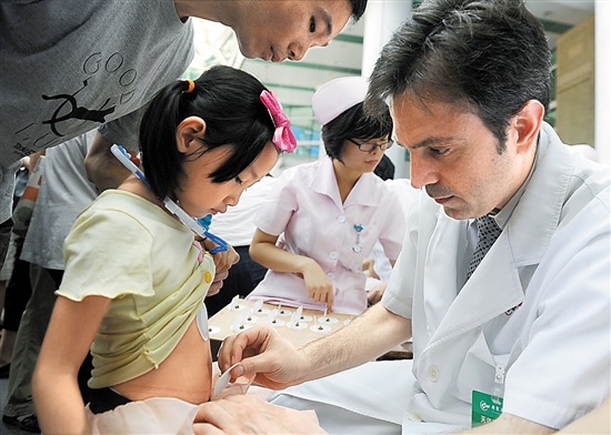广东省中医院也曾有不少老外中医实习生。图中是一位老外中医师在医院举行的惠民活动中,给中国孩子贴天灸贴。据说,当时不少人都对这位老外中医师相当有兴趣,愿意找他“试试身手”。