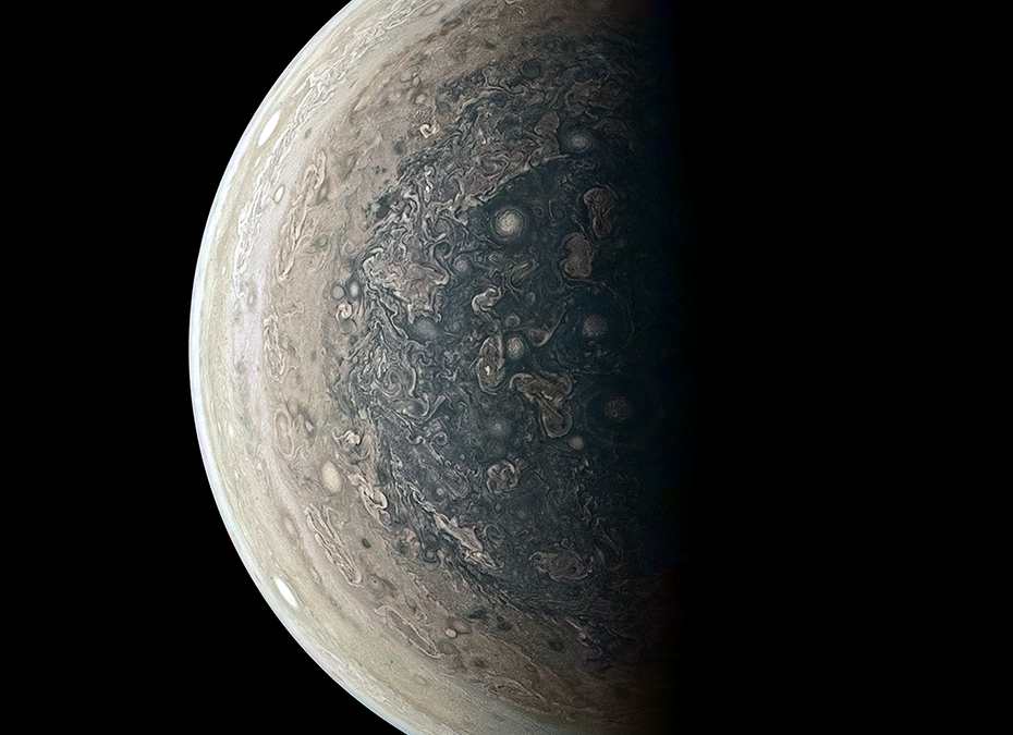 这张木星南极的图像使用了颜色增强技术,突出显示了高亮的云层以及无数的椭圆形风暴。 图片来源:NASA官网