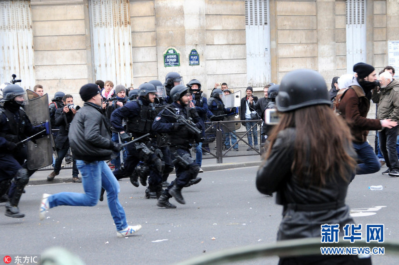 当地时间2017年2月23日,法国首都巴黎及近郊爆发学生抗议警察暴力执法的集会示威活动,并引发肢体冲突,共有40名学生被警方拘捕。据悉,集会过程中,部分示威者向警察投掷杂物和冲撞警戒线,治安部队则发射催泪瓦斯予以还击。图片来源:东方IC