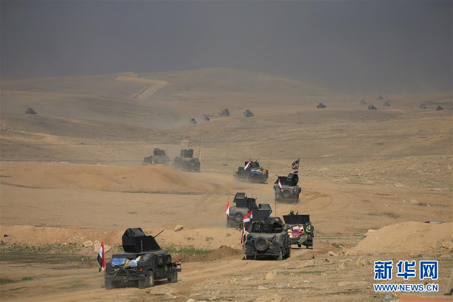2月23日,在伊拉克摩苏尔,政府军向被“伊斯兰国”控制的盖兹拉尼军营进发。