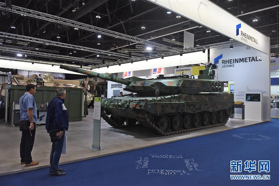 2月23日,参展人员在阿联酋阿布扎比国际防务展上参观莱茵金属公司展出的主战坦克。第十三届阿布扎比国际防务展23日在阿拉伯联合酋长国首都阿布扎比落幕。本届防务展为期5天,共签订各类军贸合同90项,交易总额191.77亿迪拉姆(约合52亿美元),比上届的50亿美元略有增长。新华社记者赵丁喆 摄