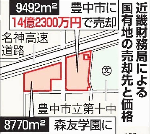去年6月,森友学园与日本国土交通省近畿财务局签署一份土地买卖合同,以1.34亿日元(约合816万元人民币)购得大阪府丰中市野田町一块面积8770平方米的国有土地。然而,与其仅一街之隔的另一块同等规模的国有土地在卖给丰中市时,售价却高达14.23亿日元,是前者的10多倍。
