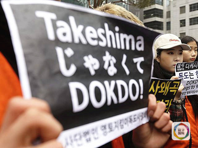 2月22日,韩国首尔,抗议者举着标语牌围聚在日本使馆前。标语上写着:“不是竹岛是独岛。”(新华/美联)