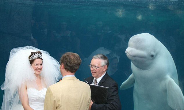 可爱!美白鲸水族馆婚礼现场“凑热闹”抢镜新婚夫妇(组图)