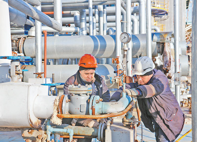 中哈里海沥青合资公司哈萨克斯坦员工在认真检修工厂设备。本报记者 周翰博摄
