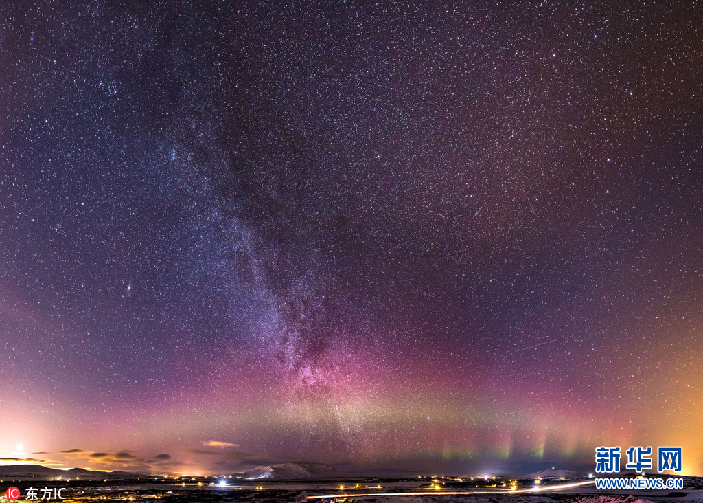 2017年3月1日报道(具体拍摄时间不详),摄影师Sigurour William Brynjarsson领着一群人在冰岛的Kerio火山口拍摄北极光,过程中他拍摄下了一组非常美丽的极光照片。照片里,色彩缤纷的北极光舞动在夜空之中,远远看上去仿佛科幻电影中UFO着陆地球一般,震撼极了。图片来源:东方IC