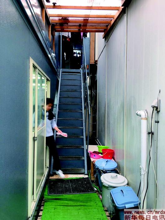 ▲研修生简易房内狭窄的楼梯。本报记者蓝建中摄