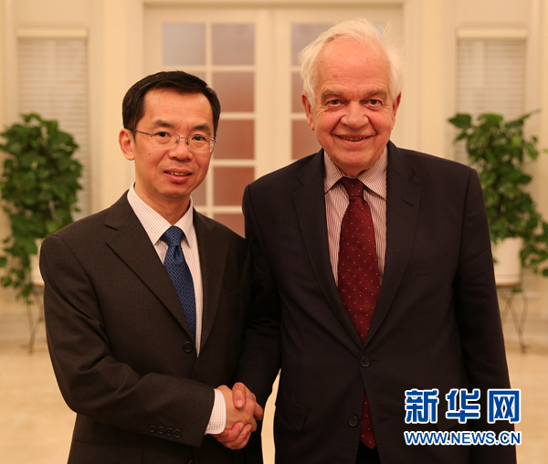 中国驻加拿大大使卢沙野和加拿大新任驻华大使麦卡勒姆合影。新华网记者李保东 摄