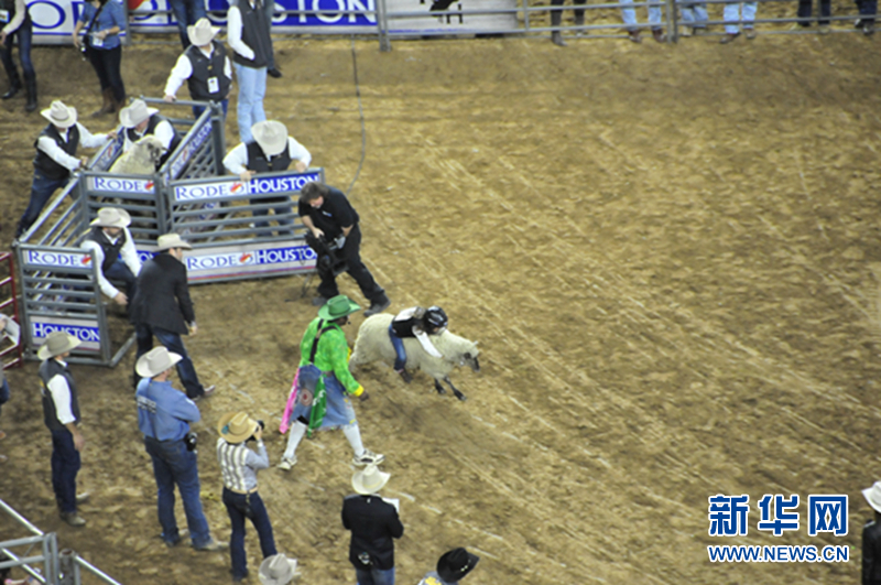 3月8日,在美国休斯敦,一位小骑士正在骑着一头绵羊奔跑。第85届休斯敦牛仔节于3月7日开幕,牛仔节期间将举行骑牛、骑马、牛仔服饰展销等多种活动。新华网记者 张永兴 摄