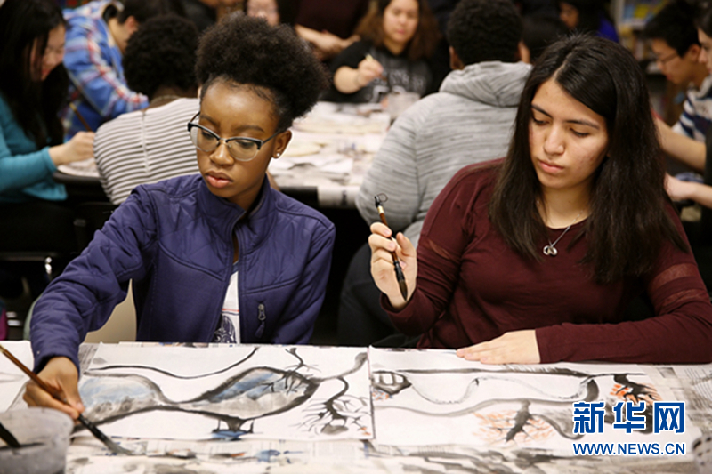 3月9日,在芝加哥佩顿中学,学生在校内的孔子学院教室学习画中国水墨画。第9届“中国文化美国行”活动于2月27日至3月10日在芝加哥地区20多所公立学校举行。新华网记者 汪平 摄