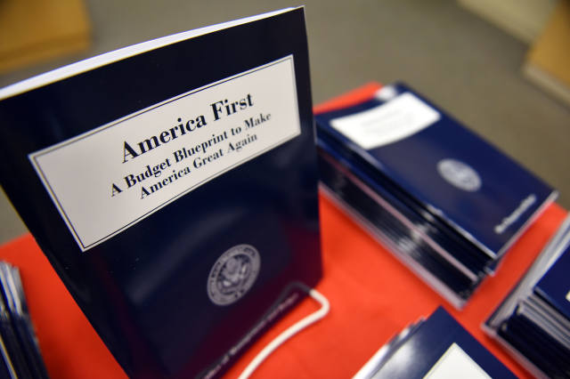 这是3月16日在美国首都华盛顿拍摄的2018财年联邦政府预算纲要报告。美国白宫当日公布2018财年(从今年10月1日至明年9月30日)联邦政府预算纲要报告,提议大幅增加国防预算540亿美元,同时同等削减国务院、环保局、农业部等的非国防支出,希望在不扩大财政赤字的前提下增强美国国防安全和“硬实力”。2017-03-17 08:17:36