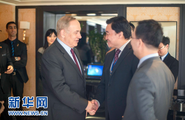 3月22日,以色列总理内塔尼亚胡与新华网友在线交流。访谈开始前,新华网董事长、总裁田舒斌(右)与以色列总理内塔尼亚胡(中)亲切交谈。新华网 孙韬 摄