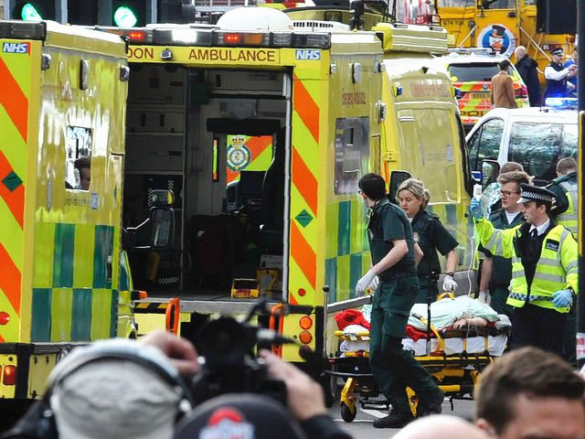 3月22日,伦敦议会大厦外,救援人员将一名伤者推向救护车。(新华/法新)