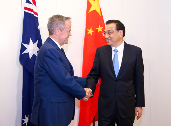 李克强总理会见澳大利亚反对党工党领袖肖滕。