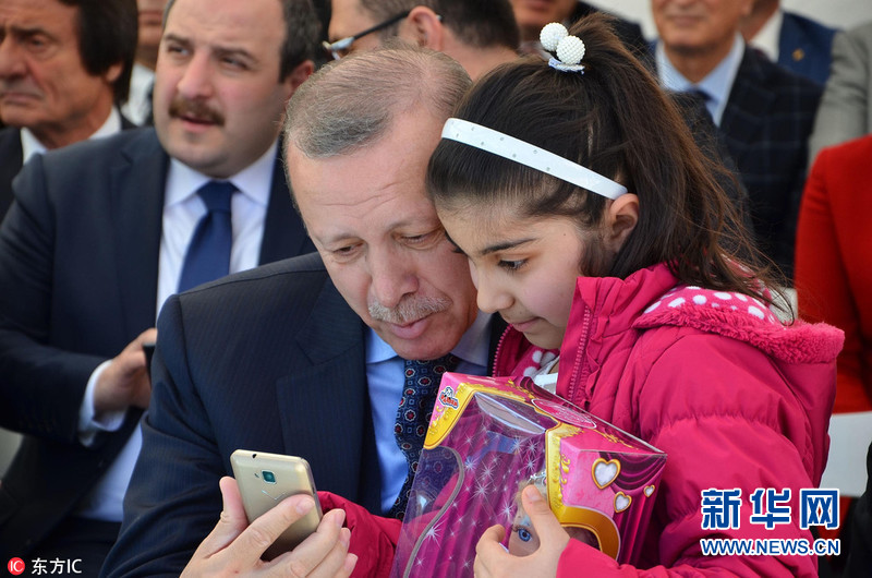 当地时间2017年3月24日,土耳其代尼兹利,土耳其总统埃尔多安出席活动,现场与萌娃玩手机秀亲民,为修宪公投积极造势。土耳其将于4月16日举行公投,以决定是否将政体从议会制改为总统制。图片来源:东方IC