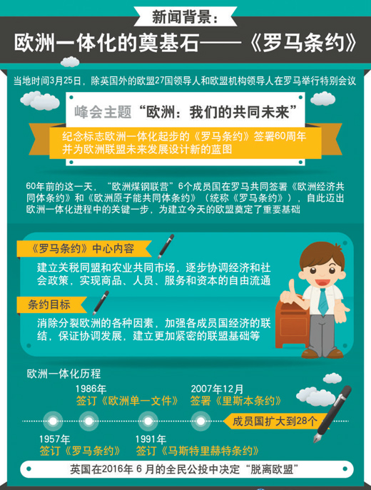 3月25日,除英国以外的欧盟27个成员国的领导人和欧盟机构领导人,在意大利首都罗马召开特别峰会,纪念《罗马条约》签署60周年,并于会后签署《罗马宣言》,为欧盟未来10年的发展规划蓝图。