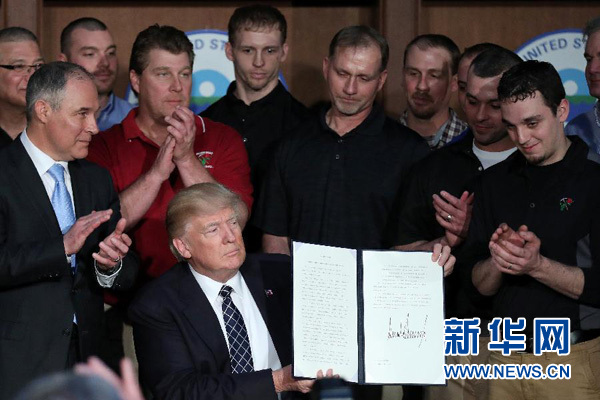 在20多名煤矿工人和一些政府官员的见证下,特朗普当天在美国环境保护局签署了这份行政命令,声称要“终结(奥巴马政府发起的)煤炭战争”。