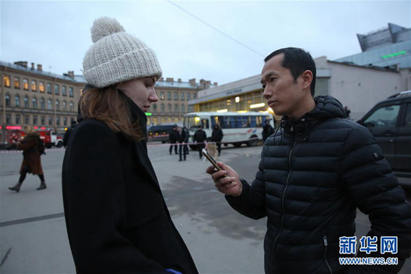 4月3日,在俄罗斯圣彼得堡,记者在事发地铁站外采访。新华社发(莫京娜摄)