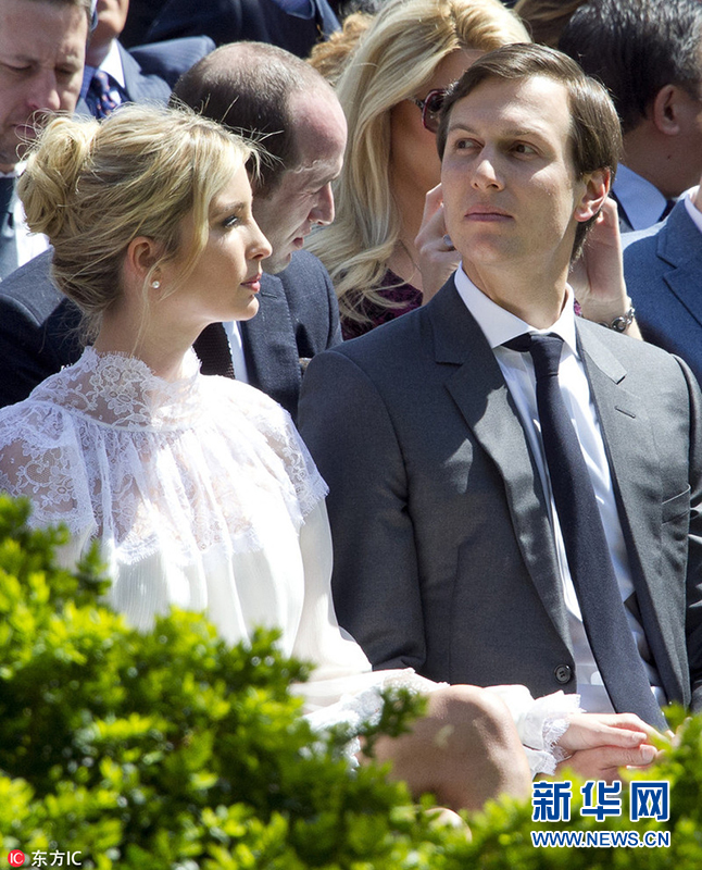 当地时间2017年4月5日,美国华盛顿,美国总统特朗普与妻子梅拉尼娅欢迎到访的约旦国王阿卜杜拉二世以及王后拉尼娅,在白宫玫瑰园召开联合发布会,伊万卡与丈夫库什纳现身。图片来源:东方IC