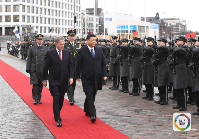 4月5日,国家主席习近平在赫尔辛基同芬兰总统尼尼斯托举行会谈。会谈前,习近平出席尼尼斯托在总统府庭院举行的隆重欢迎仪式。新华社记者饶爱民摄