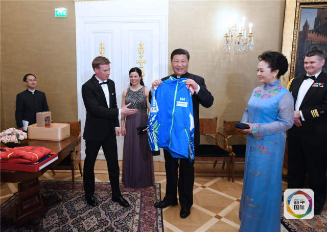 当地时间4月5日晚,国家主席习近平和芬兰总统尼尼斯托在赫尔辛基共同会见刚刚参加完2017年世界花样滑冰锦标赛的中芬两国冰雪运动员代表。习近平夫人彭丽媛和尼尼斯托夫人豪吉欧参加会见。这是芬兰运动员向习近平和夫人彭丽媛赠送运动衣。新华社记者饶爱民摄