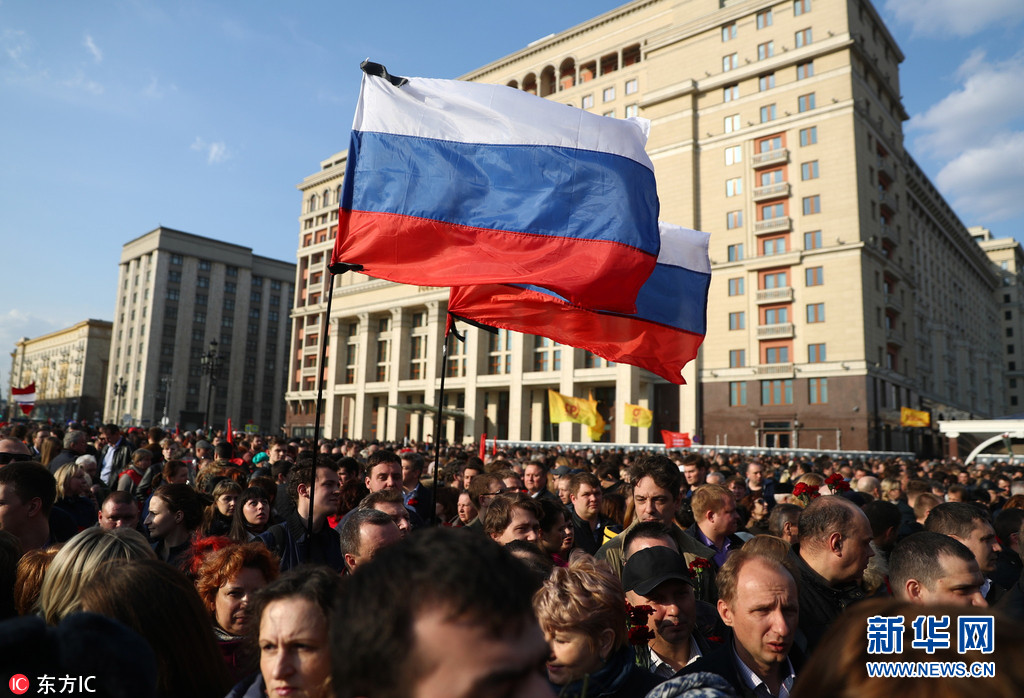 当地时间2017年4月6日,俄罗斯莫斯科,民众在红场附近参加集会活动,纪念圣彼得堡地铁爆炸遇难者。图片来源:东方IC