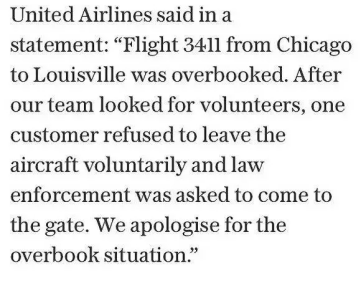 尽管已有前车之鉴,但美联航似乎并不吸取教训,此次强行拖拽乘客下机事件,再次将其推向了风口浪尖。