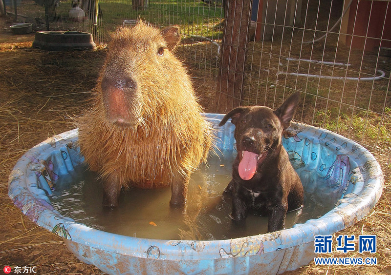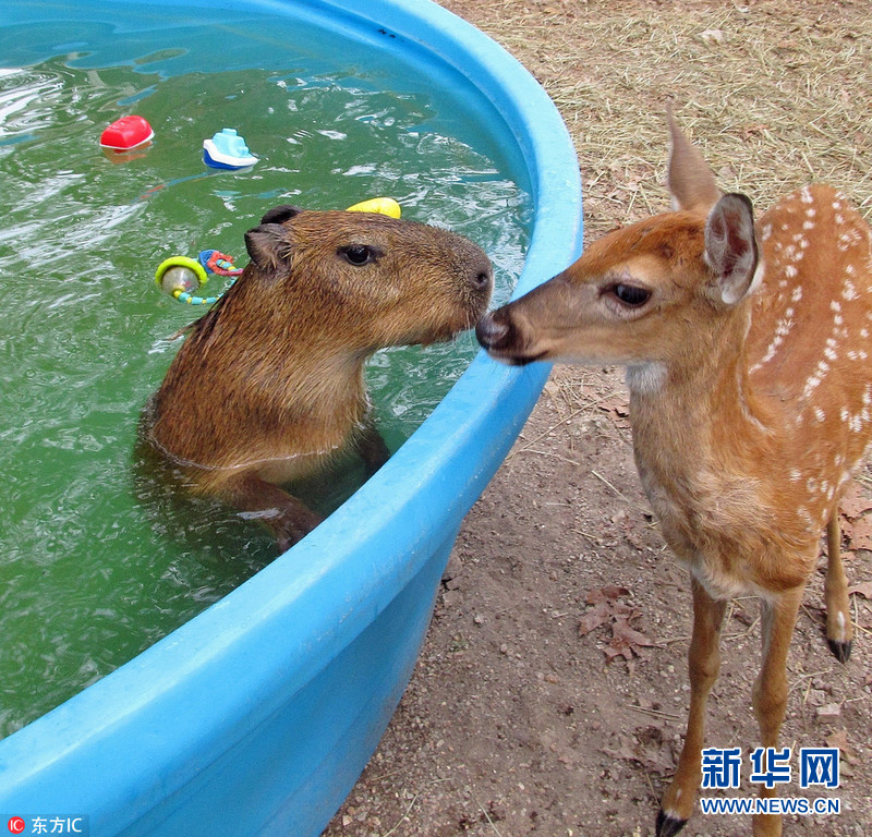 2017年4月12日报道(具体拍摄时间不详),这只可爱的水豚太过于博爱,竟然扮演起了与之生活在一起所有动物的妈妈。6岁的水豚Cheesecake6年前被美国阿肯色州的Rocky Ridge Refuge救助机构收养,自那以后,它就和10多种不同的动物生活在一起,这么多年来,它常被拍到与各种各样动物依偎在一起的可爱画面,像是和狗、鸡、鹿、迷你马和小鸭子。Cheesecake也很受游客的欢迎,中心的创建人贾尼斯(Janice Wolf)说,Cheesecake受小动物的喜爱,是因为它总是很关爱大家。现在,Cheesecake最好的朋友是一只鸡,名叫埃尔韦拉(Elvira)。埃尔韦拉是一只很高冷傲娇的鸡,它不愿意和其它母鸡一起玩耍,但却愿意和Cheesecake一起睡,一起吃,甚至爬到Cheesecake背上搭便车。图片来源:东方IC
