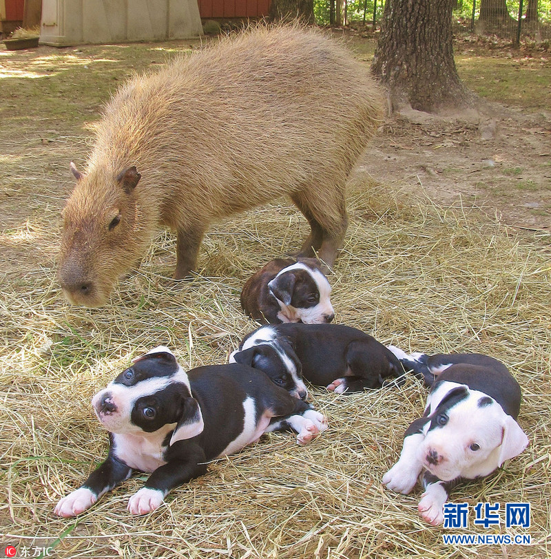 2017年4月12日报道(具体拍摄时间不详),这只可爱的水豚太过于博爱,竟然扮演起了与之生活在一起所有动物的妈妈。6岁的水豚Cheesecake6年前被美国阿肯色州的Rocky Ridge Refuge救助机构收养,自那以后,它就和10多种不同的动物生活在一起,这么多年来,它常被拍到与各种各样动物依偎在一起的可爱画面,像是和狗、鸡、鹿、迷你马和小鸭子。Cheesecake也很受游客的欢迎,中心的创建人贾尼斯(Janice Wolf)说,Cheesecake受小动物的喜爱,是因为它总是很关爱大家。现在,Cheesecake最好的朋友是一只鸡,名叫埃尔韦拉(Elvira)。埃尔韦拉是一只很高冷傲娇的鸡,它不愿意和其它母鸡一起玩耍,但却愿意和Cheesecake一起睡,一起吃,甚至爬到Cheesecake背上搭便车。图片来源:东方IC