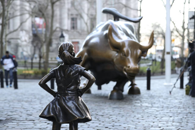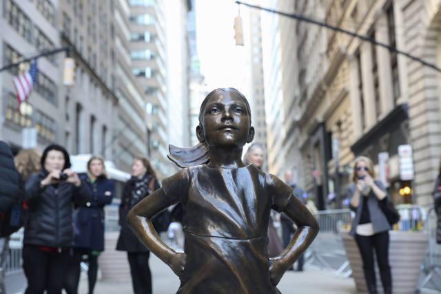 “无畏女孩”青铜雕塑由美国艺术家克里斯滕·比斯瓦尔受波士顿一家投资公司委托创造,意在彰显女性在企业领导层的作用,倡导男女平等。雕塑3月7日被摆放在铜牛对面,最初打算只陈列一周,但是一出现就引起公众关注。纽约市长比尔·德布拉西奥随后宣布,雕塑将至少保留到明年3月。