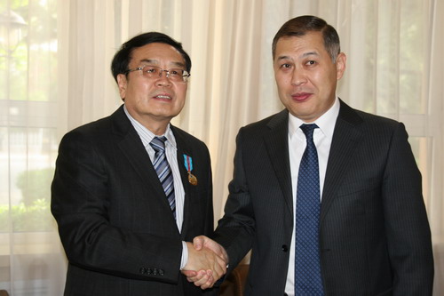 努雷舍夫说,为纪念哈独立25周年,纳扎尔巴耶夫总统签署总统令,向长期支持哈各项事业发展的世界友好人士颁发纪念奖章。在中国,该奖章仅授予两人,另一位是首任驻哈大使张德广。