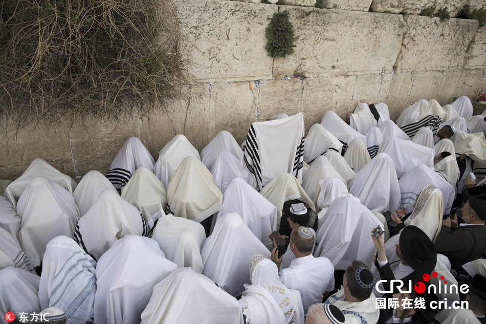 当地时间2017年4月13日,耶路撒冷,犹太教徒在哭墙下祷告,庆祝逾越节。图片来源:东方IC