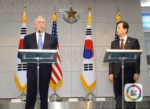 2月3日,在韩国首尔,美国国防部长马蒂斯(左)与韩国国防部长官韩民求出席新闻发布会。 新华社/法新