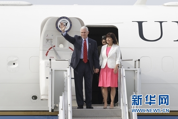 4月16日,在韩国乌山空军基地,美国副总统迈克·彭斯(前排左)走出机舱。当日,美国副总统迈克·彭斯抵达韩国乌山空军基地,开始访韩行程。 新华社发(李相浩摄)