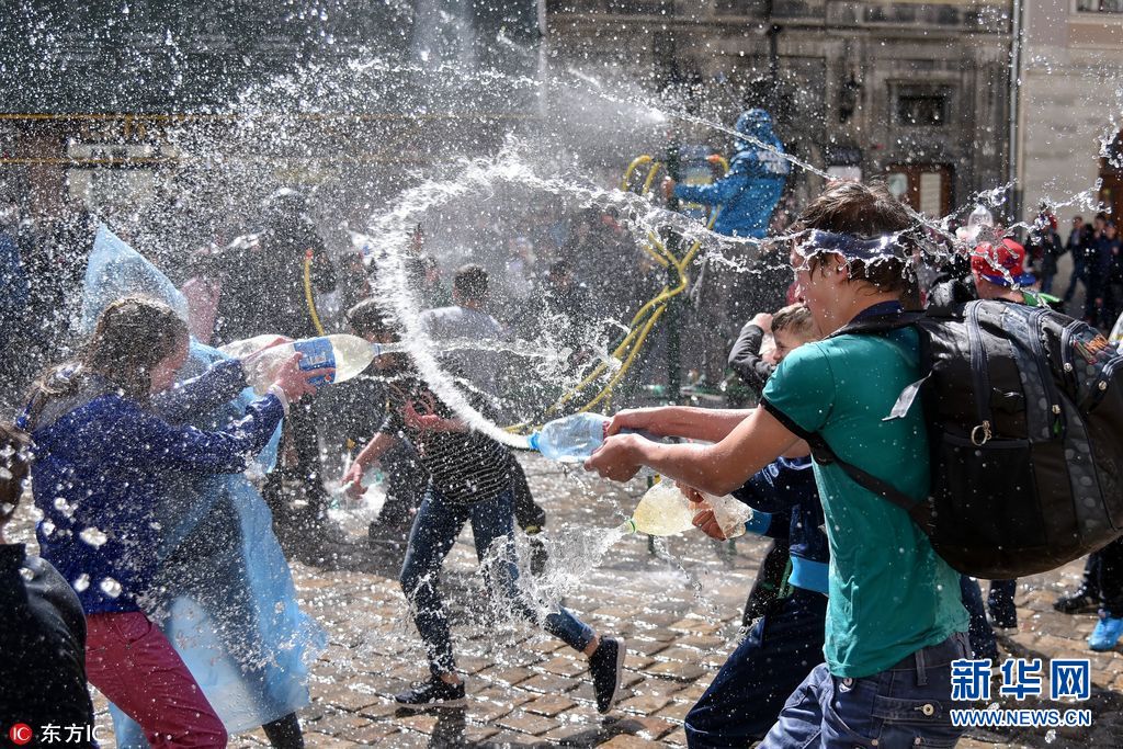 当地时间2017年4月17日,乌克兰利沃夫市,人们在街头互相泼水,这是东正教复活节后第一个星期一的传统活动,是一项古老的春季净化仪式。(图片来源: 东方IC)