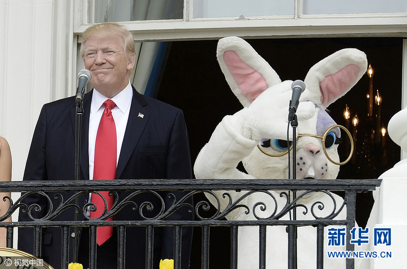 当地时间2017年4月17日,美国华盛顿,白宫举行第139届复活节彩蛋活动。在活动中的奏国歌环节,特朗普忘了右手抚在左胸上表示效忠,第一夫人梅拉尼娅及时提醒了他。白宫表示,预计将有21000人参加。首次白宫复活节滚彩蛋活动始于1878年,当时的总统拉瑟福德•海斯邀请当地儿童在白宫南草坪滚彩蛋。图片来源:视觉中国