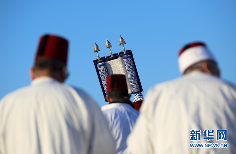 4月17日,在约旦河西岸城市纳布卢斯附近的盖里济姆山,撒马利亚人祭司在山顶诵经。撒马利亚人晨祷在历时一周的逾越节最后一天举行。撒马利亚人是以色列人的一个旁支,他们自认为是真正的犹太人,现仅存700多人。他们在日常生活中讲阿拉伯语,在宗教仪式中则使用一种古希伯来语。盖里济姆山是撒马利亚人的圣地,他们相信所罗门在那里建立了第一圣殿,而非犹太教所相信的耶路撒冷。新华网发(埃曼·纳巴尼 摄)