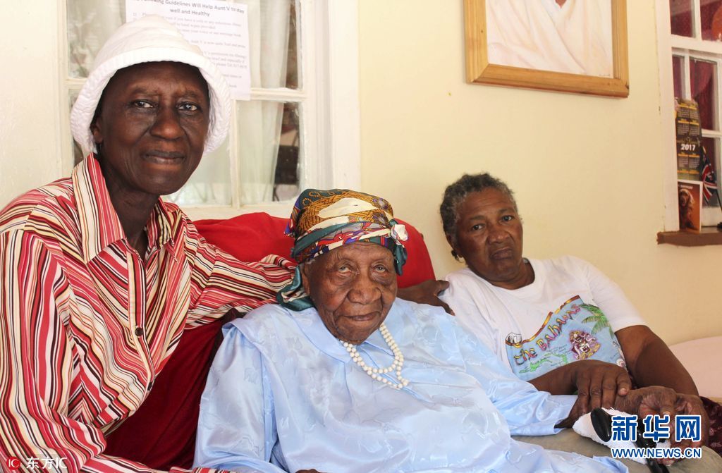 当地时间2017年4月16日,牙买加Duanvale,生活在牙买加西部山区的世界最老人瑞维奥莱特-布朗(Violet Brown)。 在上一位“世界最年长老人”埃玛-莫拉诺去世后,新的“世界最年长老人”是牙买加的维奥莱特-布朗,现年117岁。(图片来源:东方IC)