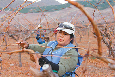 智利目前已成为了南美第一大水果出口国。图为首都圣地亚哥郊区,埃尔托雷诺葡萄园里女工在修剪枝丫。这个葡萄园生产的所有葡萄都出口中国。记者 颜欢摄
