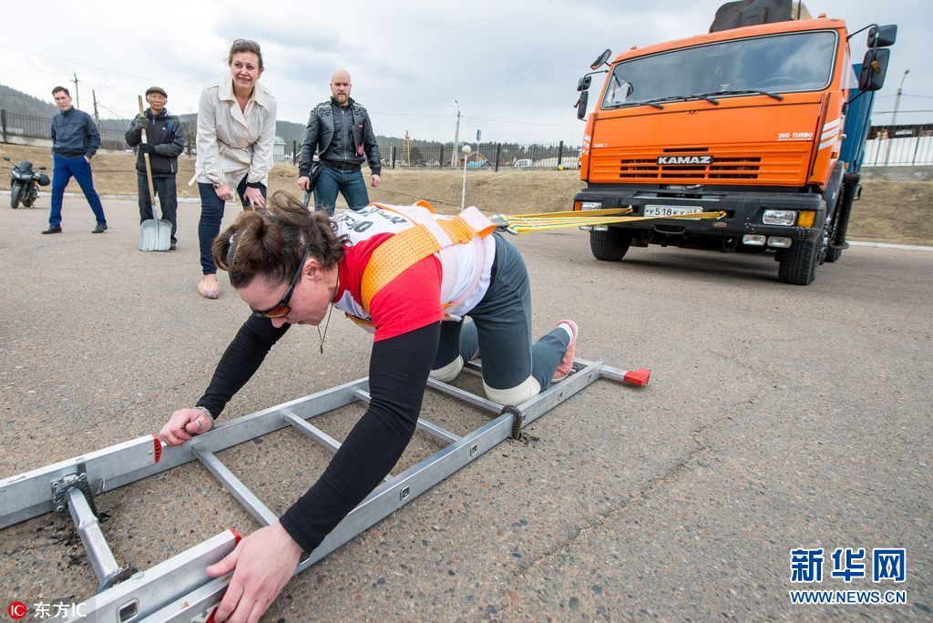 当地时间2017年4月14日,俄罗斯乌兰乌德市,在当地的一家运动俱乐部停车场内,来自伊尔库茨克的女举重队员奥柯娜-科舍丽娃(Oksana Kosheleva)拉动了一辆重达14吨的KAMAZ卡车。图片来源: 东方IC