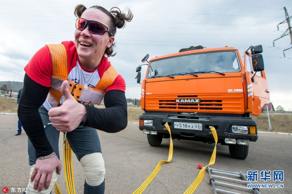 战斗民族果然很生猛!俄女子拖动14吨重卡车(组图)