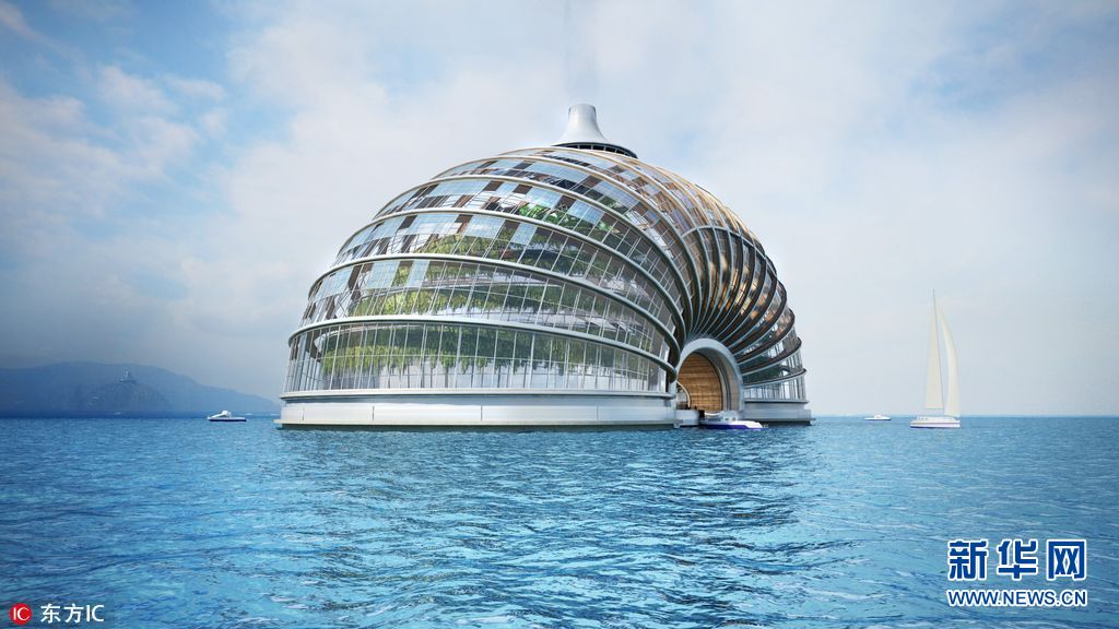 俄罗斯一个建筑师事务所和国际建筑协会设计出一种“方舟酒店”,这是一种球形的漂浮式酒店。设计者称它可以抵御海面上升引发的洪水、地震等自然灾害。此外,它是一个绿色节能酒店,太阳能板、雨水处理系统等设计,为整个酒店提供动力、水源和食物等。(图片来源: 东方IC)