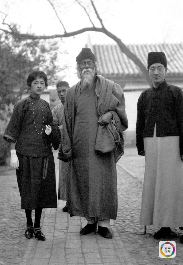 这是1924年4月,印度诗人泰戈尔访问北京时,同他的两名翻译徐志摩(右)、林徽因(左)合影。(新华社发)