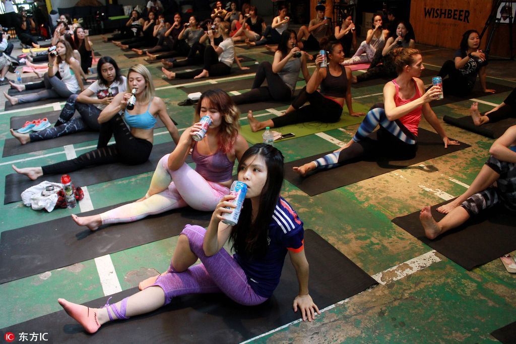 玩出新花样!泰国啤酒瑜伽 参加者边饮酒边健身(组图)