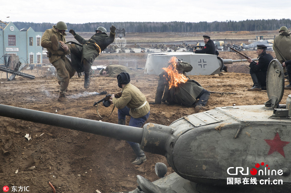 当地时间2017年4月23日,俄罗斯库宾卡,历史俱乐部的成员穿着前苏联时期的军服,重现柏林战役的恢宏景象,纪念第二次世界大战胜利72周年。图片来源:东方IC
