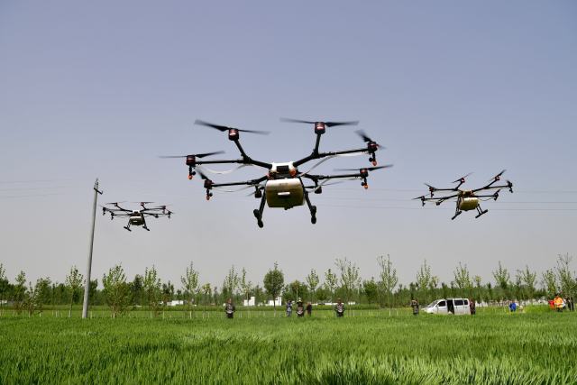 2017年4月18日,在河南省社旗县,工作人员操作无人机给小麦喷洒农药。(新华社记者冯大鹏摄)