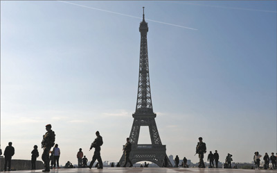 4月23日法国举行总统选举投票。图为当天在巴黎埃菲尔铁塔附近的人权广场上,士兵在巡逻警戒。新华社发